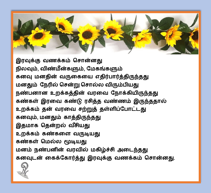 இரவுக்கு வணக்கம் by நா.பார்வதி on June 8, 2020December 2, 2020 Share this: Click to share on X (Opens in new window) X Click to share on Facebook (Opens in new window) Facebook Like Loading... Related
