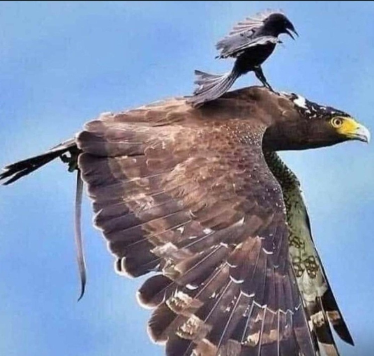 இரட்டைவால் குருவி / கரிக்குருவி எனப்படும் குருவி மட்டுமே கழுகின் மீது அமர்ந்து பயணிக்கும் தைரியம் உள்ள ஒரே பறவை இனம். இவை பயமறியா பறவை இனம். இது தன்னை விடப்பெரிய பறவைகளைக் கூட தாக்கும் குணம் கொண்டது.